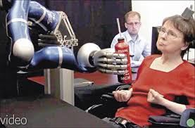 Interação entre cérebro e máquina é inédita em humanos.Técnica é uma promessa de tratamentos para tetraplégicos. A interação entre cérebro e máquinas é uma das áreas mais promissoras para a recuperação de pacientes com problemas de mobilidade, e os pesquisadores acabaram de dar mais um passo importante nessa direção. Pacientes tetraplégicos conseguiram, apenas com o pensamento, controlar um braço robótico. Foi a primeira vez que a técnica foi aplicada com sucesso em humanos. O controle de membros virtuais já tinha sido feito por macacos – inclusive em uma pesquisa conduzida pelo neurocientista brasileiro Miguel Nicolelis. O mais recente avanço, publicado na última quarta-feira (16) pela revista científica “Nature”, é fruto do trabalho de uma equipe internacional de cientistas, liderada por Leigh Hochberg, ligado às universidades Brown e Harvard, ambas nos Estados Unidos. O braço robótico, chamado de “BrainGate” (“portal do cérebro”, em inglês), é um exemplo do que os cientistas chamam de “interface cérebro-máquina”. Um pequeno sensor é colocado no cérebro, em uma parte conhecida como córtex motor, que coordena os movimentos. Os sinais elétricos enviados pelos neurônios são levados diretamente para o aparelho, que responde aos estímulos e se movimenta. A tecnologia, que ainda está a anos de ser aplicada na prática por pacientes em geral, foi testada com sucesso em duas pessoas. Nesses testes, técnicos que elaboraram o projeto acompanharam o uso em condições controladas, e calibraram o braço robótico na casa dos pacientes. Os primeiros pacientes a ter acesso à tecnologia foram um homem de 66 anos e uma mulher de 58. Os dois perderam os movimentos do corpo depois de sofrerem acidentes vasculares cerebrais (AVCs) – ela em 1996 e ele em 2006. A paciente Cathi Hutchinson (foto) disse que não precisou se concentrar mais que o normal para controlar o braço robótico, que ela usou para trazer uma garrafa até a boca e beber de um canudo. “Bem no começo, eu tive que me concentrar e focar nos músculos que usaria para fazer certas funções. O BrainGate me deu uma sensação natural e confortável, então me acostumei rapidamente à experiência”, afirmou. Teoricamente, os avanços na área devem servir para pacientes paralisados por diferentes motivos, desde lesões na coluna a doenças degenerativas como a esclerose lateral amiotrófica. Fonte: G1 |